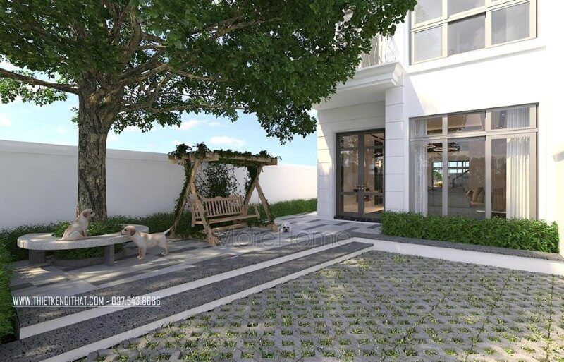 Sân vườn đơn giản nhưng mang lại cảm giác thư thái từ ghế xích đu gỗ, bóng mát sân vườn trong thiết kế ngoại cảnh biệt thự, nhà phố.
