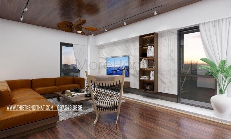 Phòng khách hiện đại, đẹp, sang trọng với ý tưởng kết hợp giữa sắc trắng cùng gam sẫm màu từ gỗ ốp tường, gỗ lát sàn.