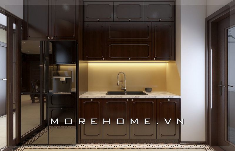 Thiết kế nội thất phòng bếp với tone màu trầm từ gỗ tự nhiên tạo cảm giác sang trọng và cuốn hút