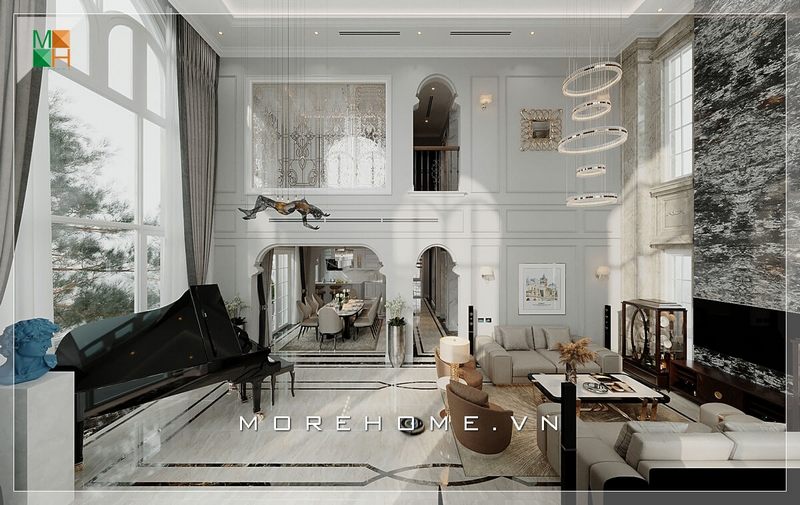 Sự trang trí đồ nội thất theo phong cách tân cổ điển đã tạo nên nét đẹp độc đáo, sang trọng, quý phái cho không gian phòng khách đặc biệt với các loại hình nhà như biệt thự, nhà phố.
