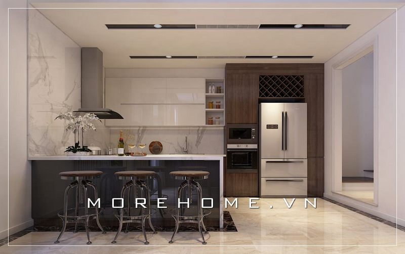 Mẫu quầy bar bếp hiện đại, mặt quầy ốp đá trắng vân mây cao cấp mang đến sự tiện nghi, sang trọng cho căn bếp của bạn