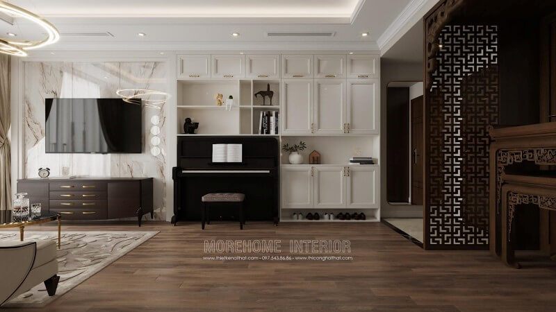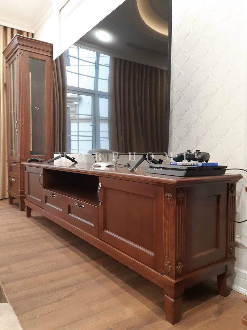 Kệ tủ tivi với kiểu dáng tân cổ điển mang đến sự sang trọng và ấn tượng cho không gian phòng khách.