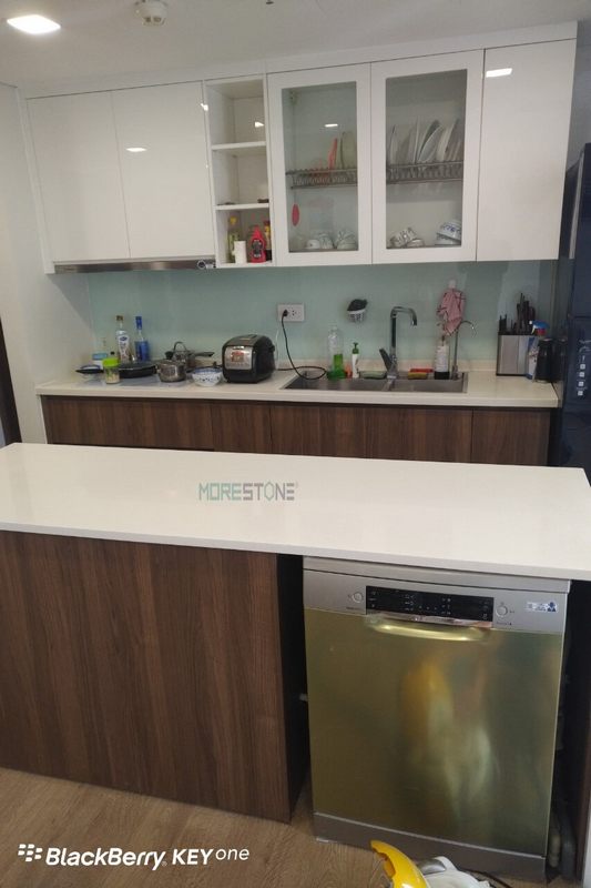 Lựa chọn đá nhân tạo vân mây màu trắng dùng ốp mặt quầy bar cũng như tường và mặt bếp mang lại sự sạch sẽ và dễ lau chùi hơn cho người nội trợ