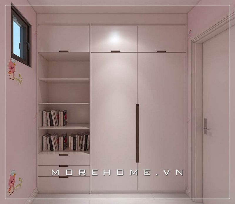 Mẫu tủ quần áo kết hợp kệ sách được thiết kế trong không gian góc của phòng ngủ vừa tiết kiệm được diện tích vừa giúp không gian tiện nghi hơn