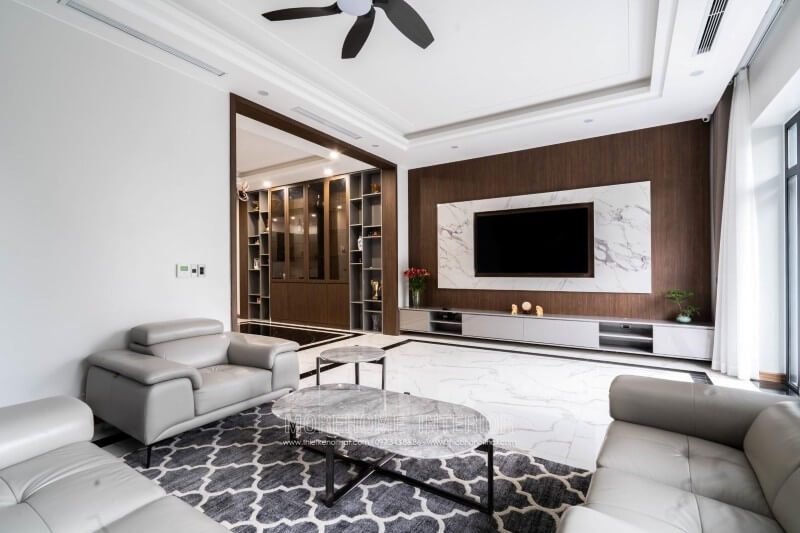 Biệt thự nhà phố có phòng khách đầy ấn tượng với bộ sofa sắc nâu đen cao cấp khung gỗ óc chó làm tâm điểm, kiểu dáng sang trọng và góc tiện lợi.