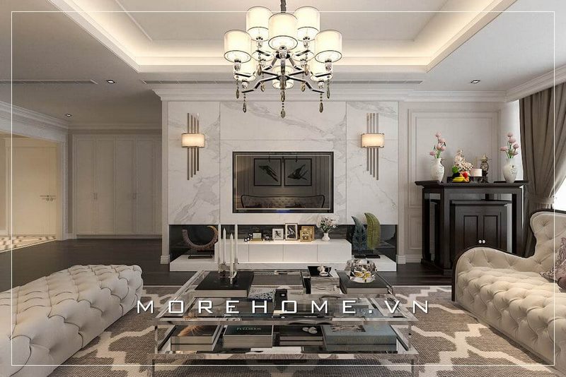 Thiết kế nội thất phòng khách chung cư cao cấp theo phong cách tân cổ điển để tạo nên sự sang trọng.